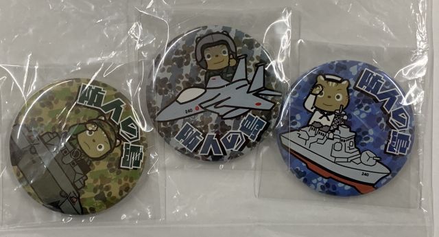 ヤマネコのキャラクターに3自衛隊の格好をさせたイラストの缶バッジです。