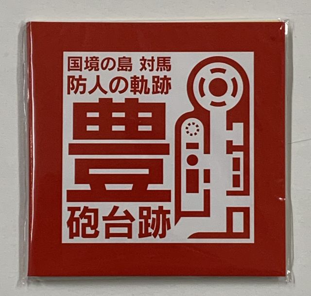 対馬の島の形に加え、金田城や豊砲台といった国防史跡のイラストを挿入しています。