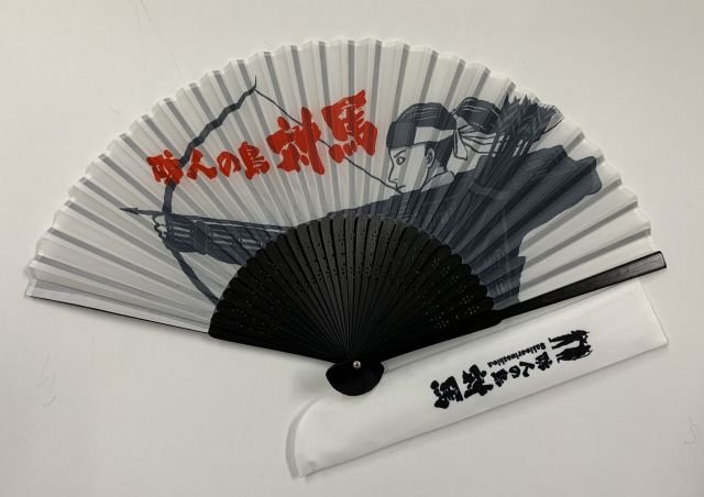 防人が弓を引くイラストに防人の島「対馬」の文字を会わせた扇子です。