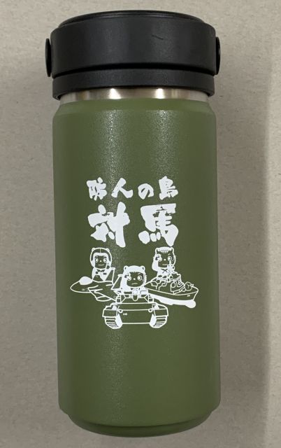 カーキ色の自衛隊カラーのボトルにヤマネコのキャラクターに3自衛隊の格好をさせたイラストを入れたサーモボトルです。
