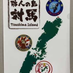 防人の島対馬の情報を電車の中刷り広告のようにレイアウトした物と対馬の3自衛隊の場所を各自衛隊のロゴで示したクリアファイルです。