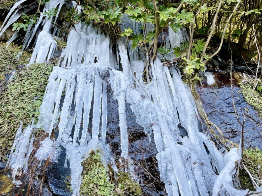 先ほど少し山へ出かけたら昨日、今日の寒さで自然の氷柱がありました。
