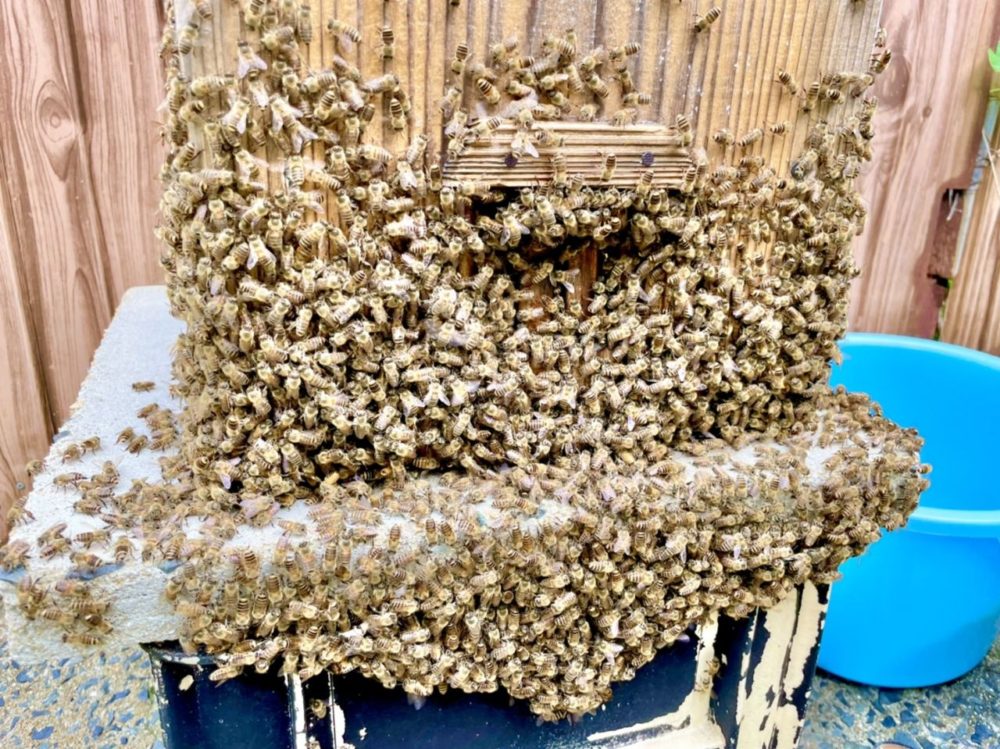 夏場は暑くて蜂洞の周りに出てきて羽を一生懸命動かして巣内に風を送ったりしていました。