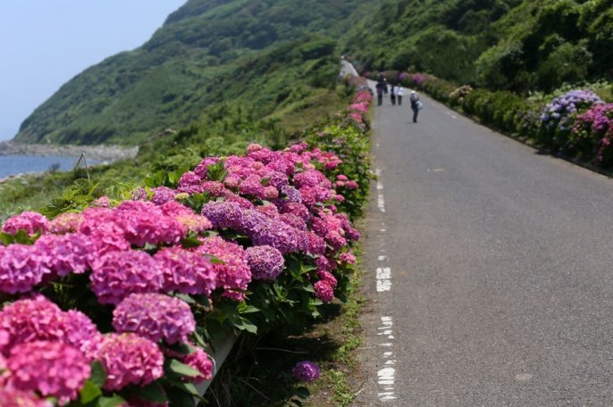 上県町佐護から「異国が見える丘展望台」にかけて、あじさいが咲き誇る道をロードウォーキングします。