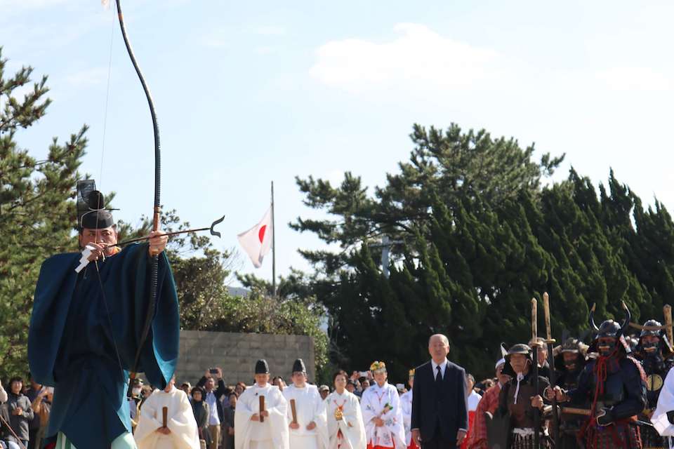 文永11年(1274年)の元寇で元・高麗連合軍と壮絶に戦い、全滅した島主・宗助国と家臣団の魂を鎮めるため、武士の子孫たちが鎧に身をかためて小茂田浜に集い、神主が海に向かって鏑矢を放つ「鳴弦の儀」が行われるようになりました。奉納相撲や奉納太鼓、出店等で賑わいを見せます。