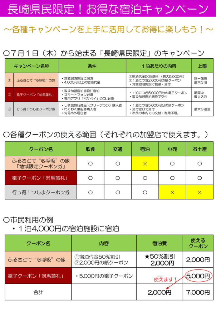 うーん、1泊4,000円の宿泊費が「心呼吸」で2,000円になり、対馬藩札(スマホに5,000円をチャージ)で宿泊費の残金を払えば3,000円が余り、さらに2,000円の地域限定クーポンがもらえるので+5,000円。