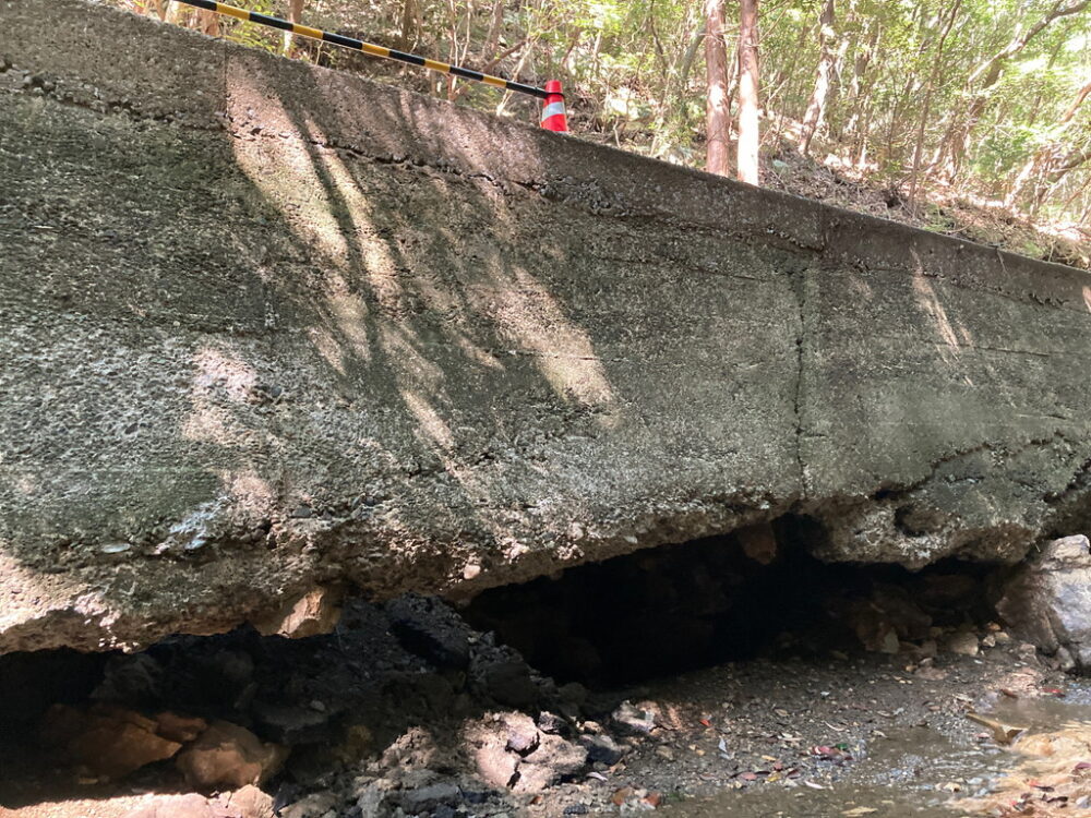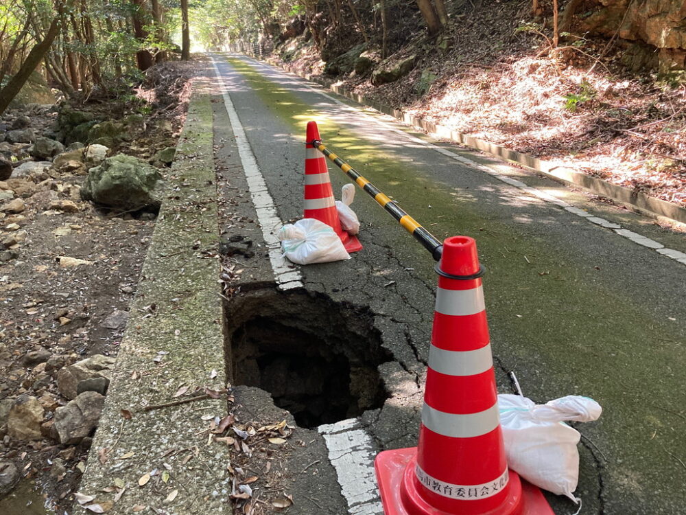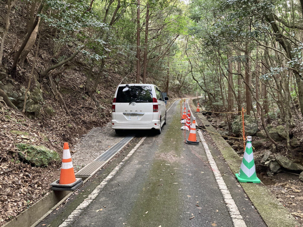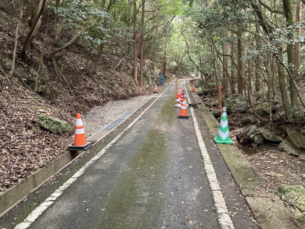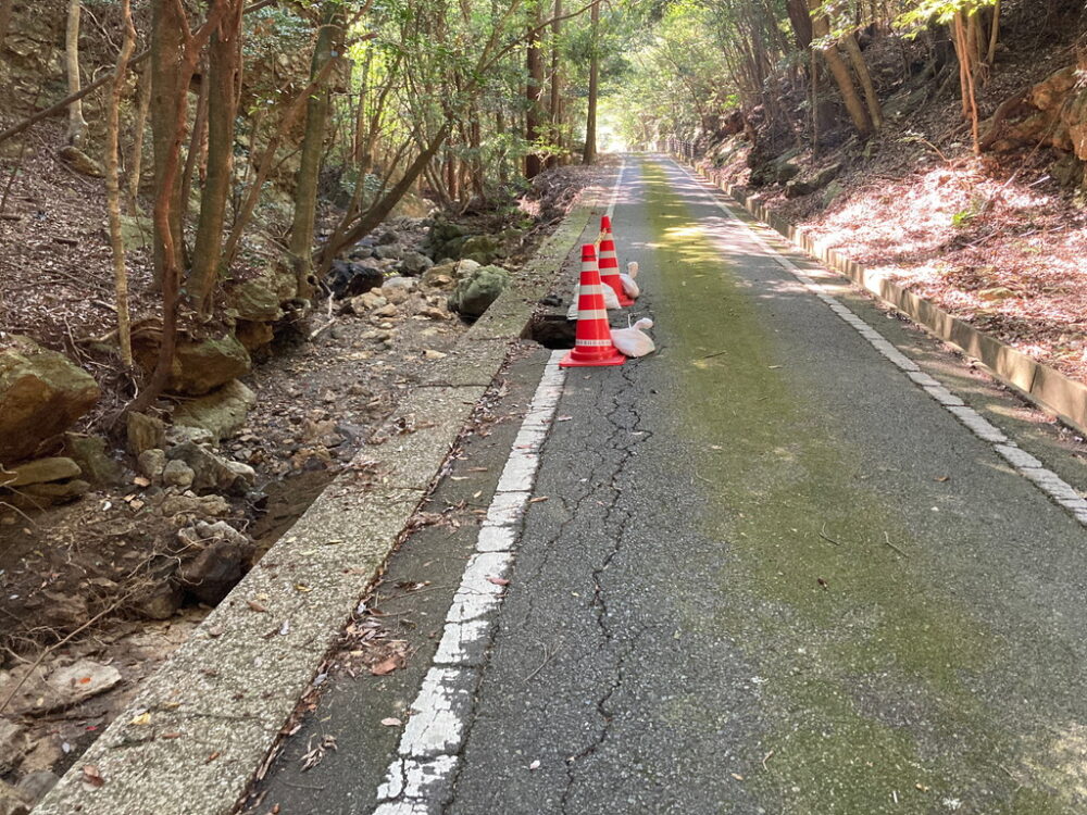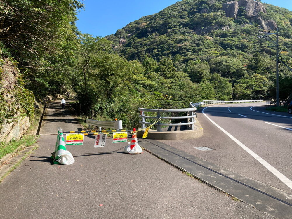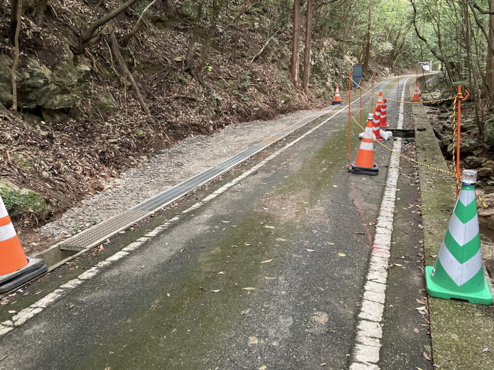 道路の陥没により2022年10月1日(土)から車両通行止めになっていた林道城戸線(県道24号城山入口~金田城登山口)は、応急処置が行われ、2022年10月8日(土)から普通乗用車の通行が可能になりました。