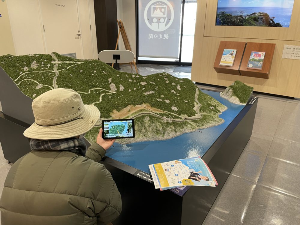 ふれあい処つしま「観光案内所」にて、タブレットの貸出を行っております。そのタブレットを使って、ぜひ皆様に金田城の歴史を楽しく学んでほしいなと思ってます。