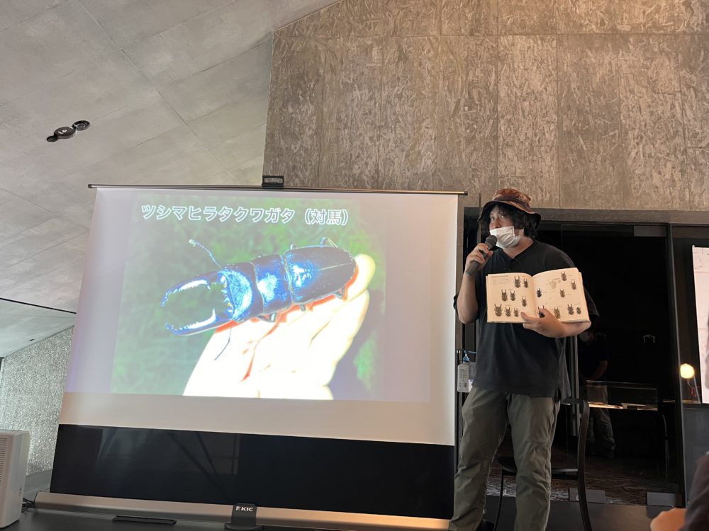 △「君たちがいつも見てるクワガタは、ツシマヒラタクワガタといって、日本最大でみんなの憧れの虫なんだぞ?当たり前に見てるからスゴさ、わかってねーだろ?忘れるんじゃねーよ?まじズルいんだから、対馬!」的なことを熱弁している平坂さん