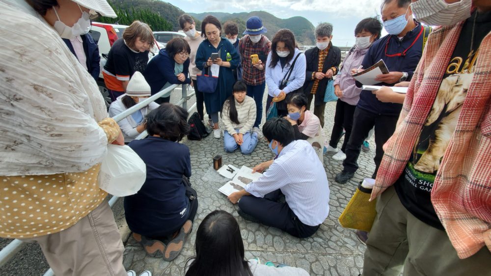 △これには信ちゃん先生も、語らずにはいられません。食べかけのおにぎり置いて海辺で解説会のはじまりです。(もぐもぐ)