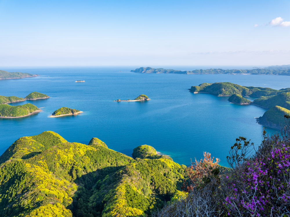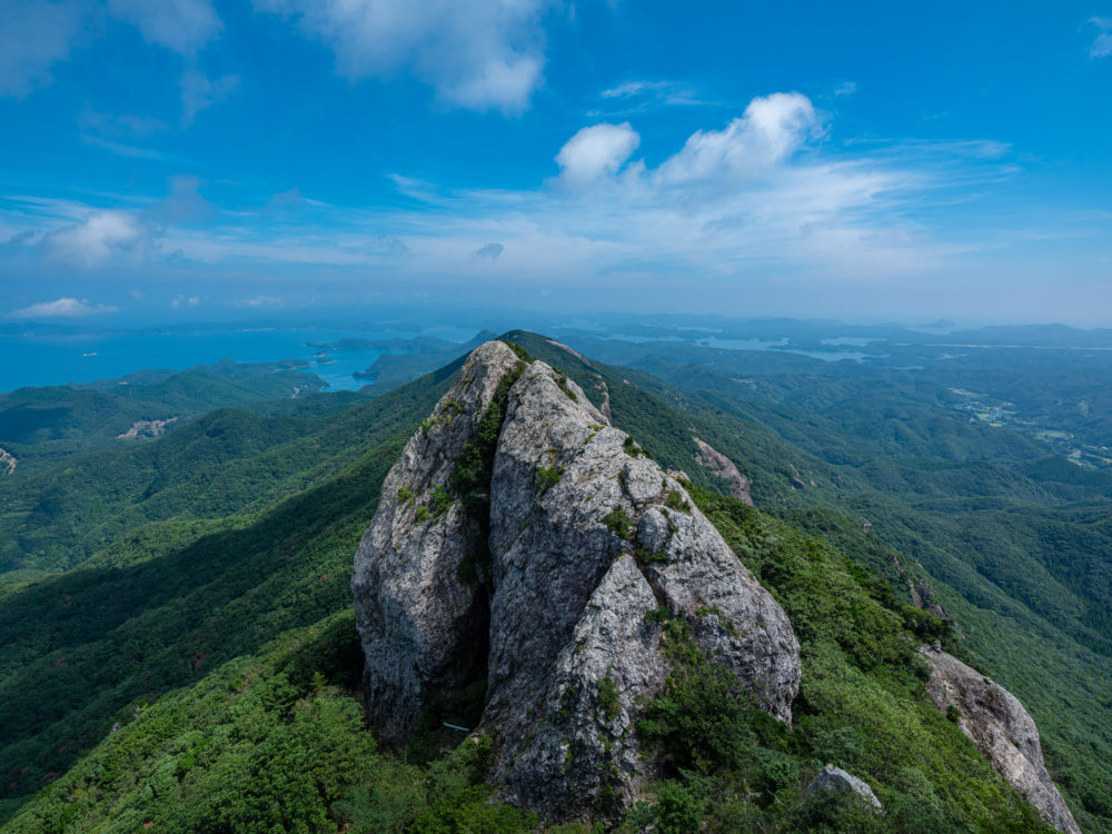 白嶽(しらたけ)は古来より霊山として崇められた対馬のシンボル的存在。大陸系植物と日本系植物が混生する独自の生態系をもつ原生林として、国の天然記念物に指定されています。春・秋には大陸系植物が開花し、山頂からは360度の眺望が広がり圧巻です。山頂近くは急傾斜でロープにつかまりながら岩場を登るためスリル満点!