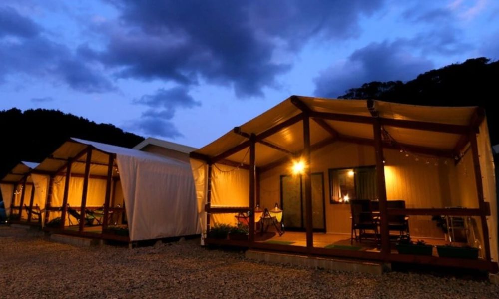 国境の島・対馬北部に位置するスロースグランピング。BBQテラスが付いた10棟のプライベートコテージと、カフェ・共有テントサイトなどが整ったグランピング施設です。