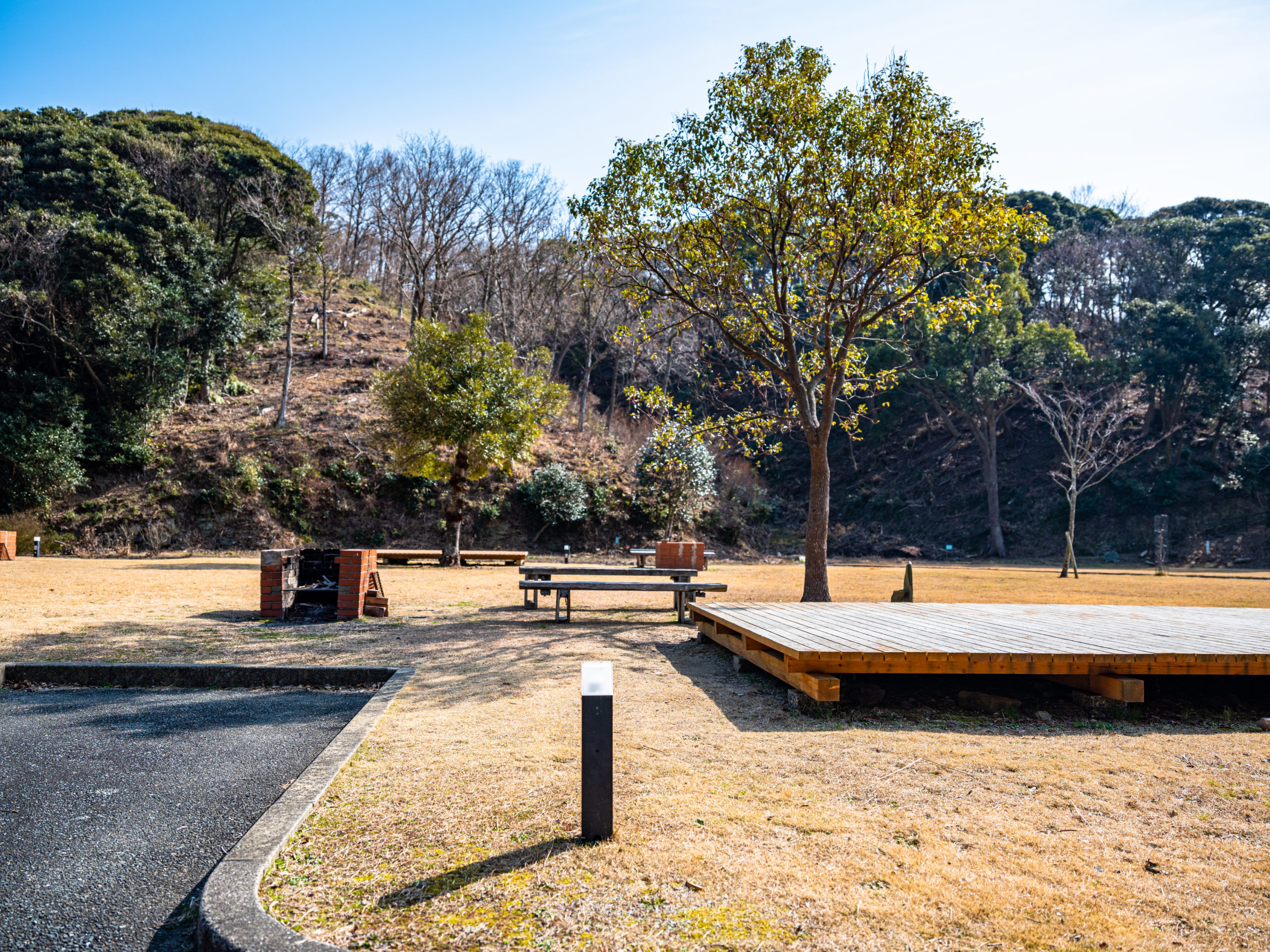 あそうベイパークのオートキャンプ場には各キャンプサイトにかまどや流しがあり、トイレやシャワーも完備されています。