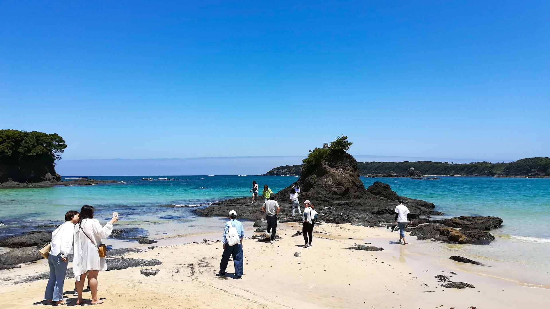 対馬北部東岸に位置する三宇田浜は、きめの細かい貝殻成分から成る天然の白浜。太陽光を浴びるとエメラルドグリーンの輝く海となり、見るものを感動させます。「ペンション三宇田」や温泉施設「渚の湯」、キャンプ場などもあり、海水浴やアウトドアを楽しむにはもってこいの立地です。