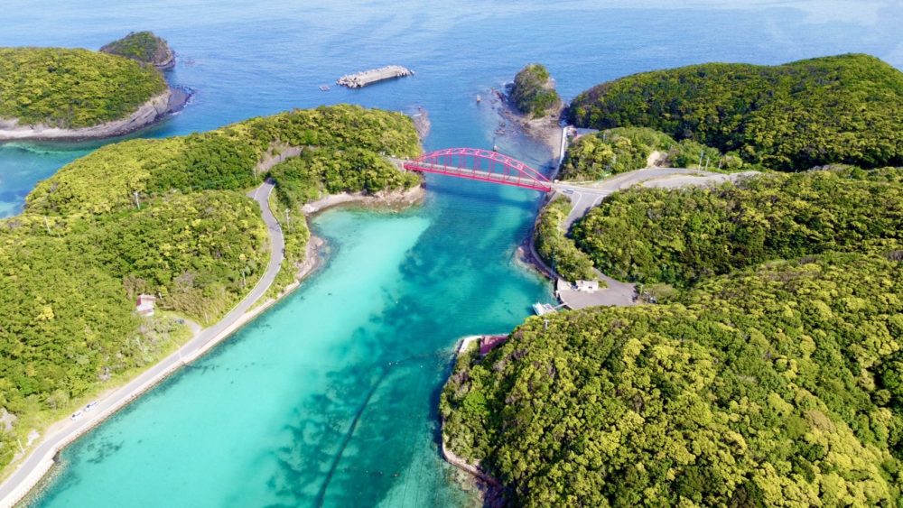 対馬中部の東側に位置する沖ノ島と赤島の海峡に架かる赤い橋が目を引きます。