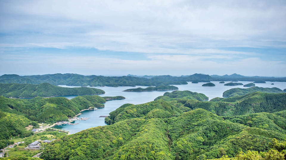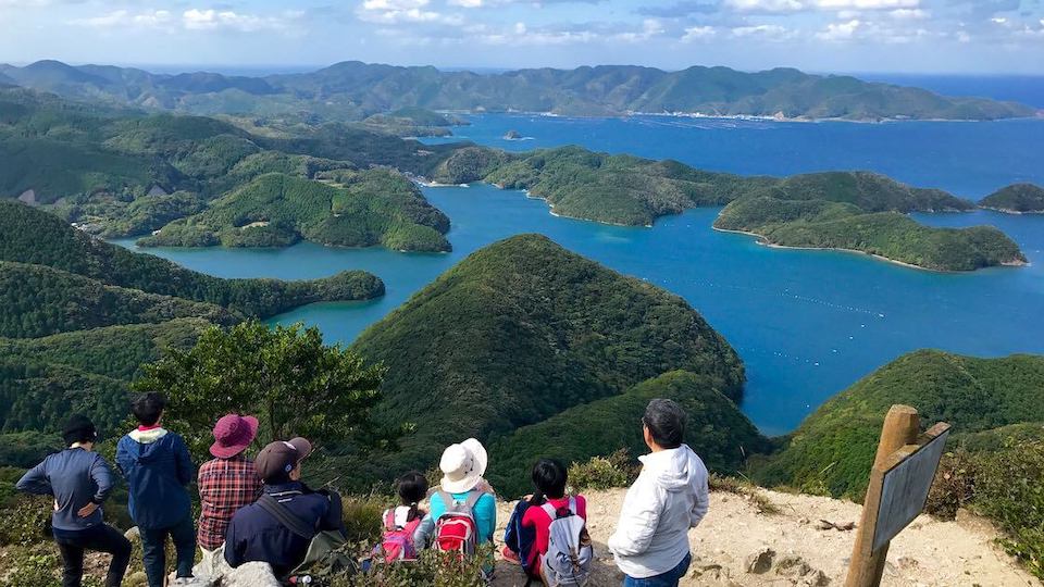 烏帽子岳(標高176m)は、対馬の中央に広がる浅茅湾(あそうわん)の北岸に位置し、360度をぐるりと見渡せる展望台です。山頂近くまでの道路と駐車場が整備されており、駐車場から展望台への階段を10分ほど登ると、東には対馬海峡、西には朝鮮海峡が広がり、複雑な入り江と無数の島々がおりなす典型的なリアス海岸の景観を一望できます。
