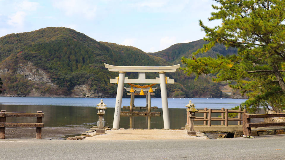 彦火火出見尊(ひこほほでみのみこと)と豊玉姫命(とよたまひめのみこと)を祭る海宮で、古くから竜宮伝説が残されています。本殿正面の5つの鳥居のうち2つは、海中にそびえ、潮の干満により、その様相を変え、遠く神話の時代を偲ばせる神秘的な雰囲気を漂わせています。また社殿の裏には、巨樹・巨木が林立し、遊歩道も完備されており、森林浴が存分に楽しめます。