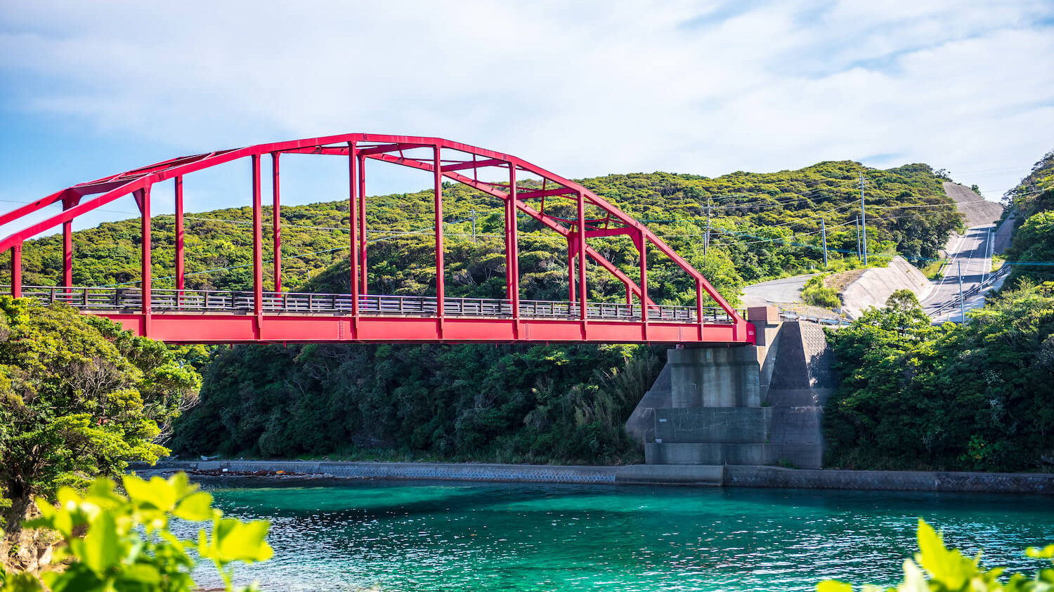 対馬中部の東側に位置する沖ノ島と赤島の海峡に架かる赤い橋が目を引きます。