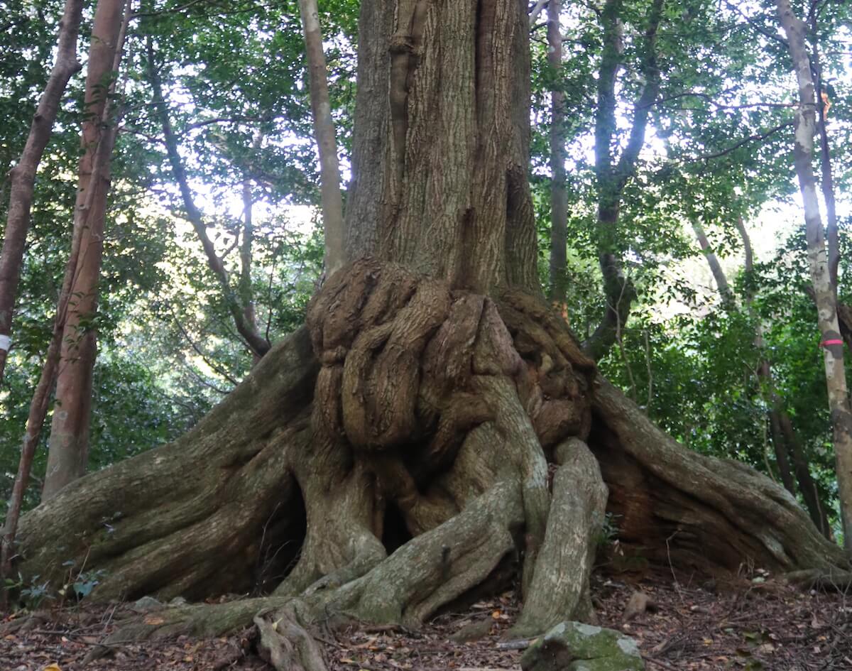 天道信仰の神体山として全山が神地されてきたため、千古斧が入ることがなく、極めて自然度の高い照葉樹林として、国の天然記念物に指定されています。森の平均樹齢は200年で、スダジイ・イスノキなどが他の地域では見ることのできない巨大な姿を見せています。
