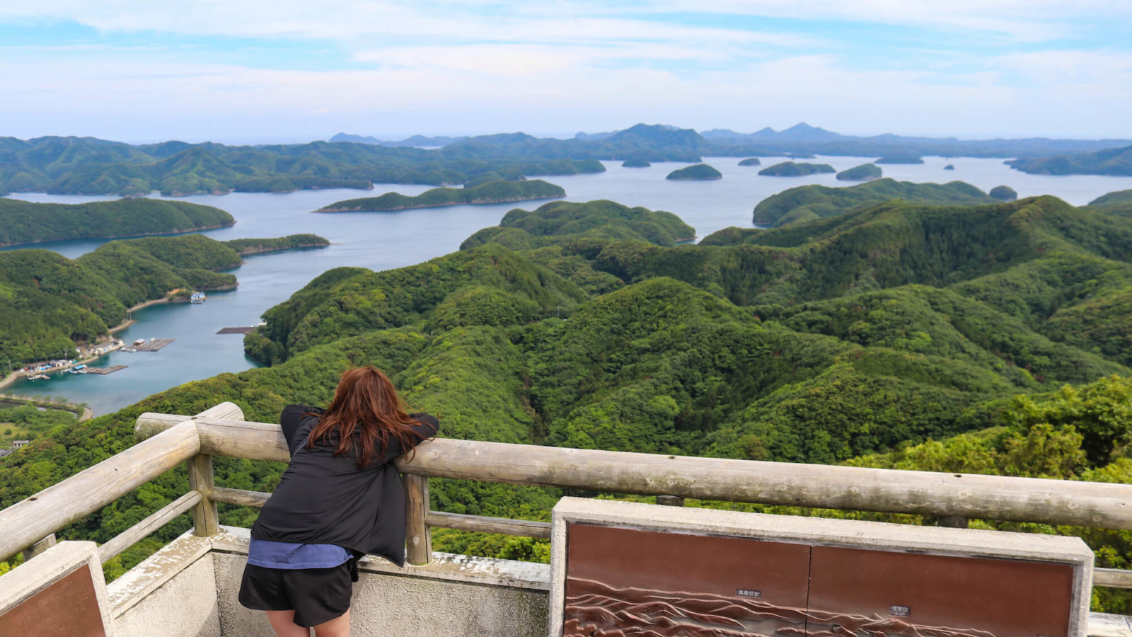 烏帽子岳(標高176m)は、対馬の中央に広がる浅茅湾(あそうわん)の北岸に位置し、360度をぐるりと見渡せる展望台です。山頂近くまでの道路と駐車場が整備されており、駐車場から展望台への階段を10分ほど登ると、東には対馬海峡、西には朝鮮海峡が広がり、複雑な入り江と無数の島々がおりなす典型的なリアス海岸の景観を一望できます。