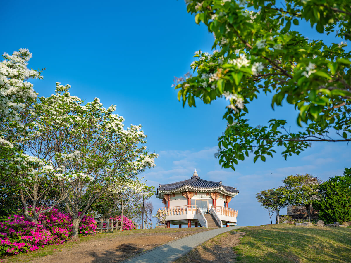 韓国まで49.5㎞の至近距離にある上対馬町は、天気のよい日には韓国釜山市の町並みが望める、まさに「国境の町」です。この展望所は、地理的にも歴史的にも深い関係にある韓国の古代建築様式を取り入れて建造されており、展望台についてはソウルのパゴダ公園にある多目的施設を、ゲートについては韓国国際ターミナル(釜山)の入口ゲートをそれぞれモデルにしています。展望所から見る釜山の夜景も大変美しく、トイレ・駐車場等も整備されているため、観光スポットとして人気を博しています。