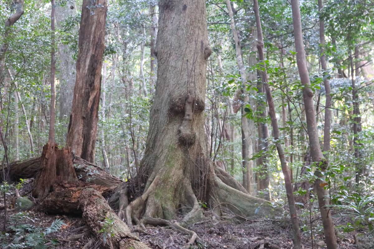 天道信仰の神体山として全山が神地されてきたため、千古斧が入ることがなく、極めて自然度の高い照葉樹林として、国の天然記念物に指定されています。森の平均樹齢は200年で、スダジイ・イスノキなどが他の地域では見ることのできない巨大な姿を見せています。
